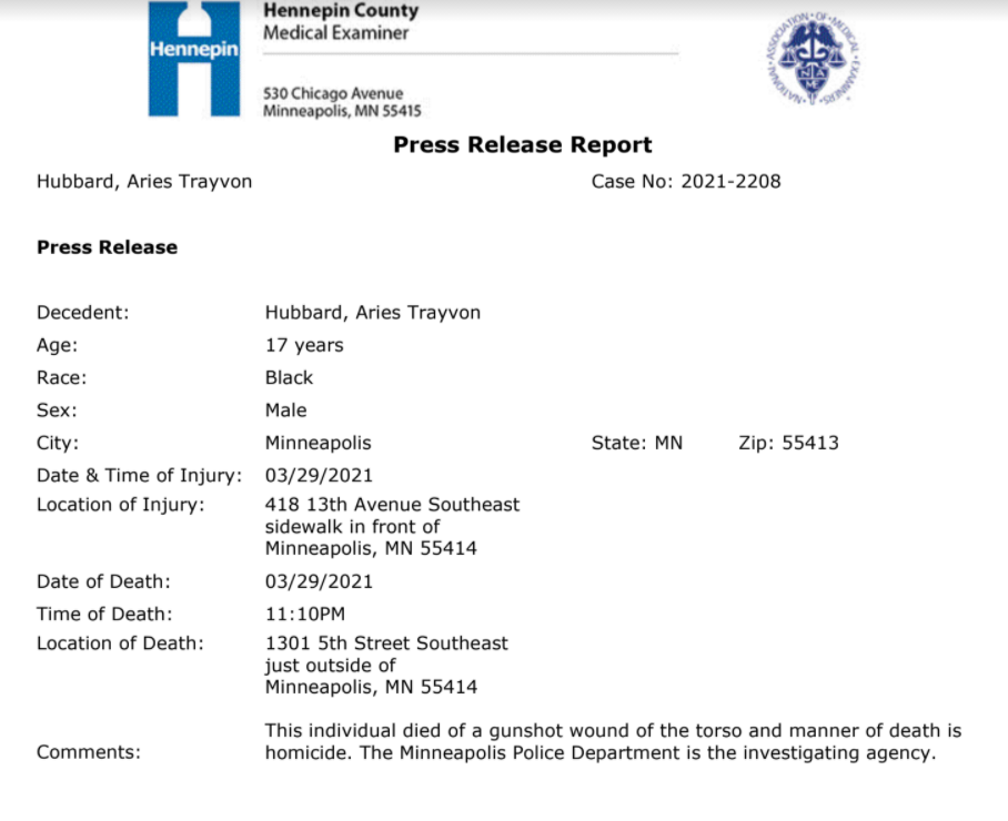 The Hennepin County Medical Examiner has identified the 17-year-old who was shot and killed Monday night in the Dinkytown neighborhood of Minneapolis as Aries Trayvon Hubbard. He died after being shot in the torso outside of Burrito Loco at 418 13th Ave. SE. around 11 p.m. March 29.