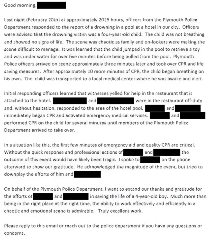 In a written recognition letter, Plymouth police credited the rapid response and early CPR with changing the outcome of the emergency, noting that the first minutes of care were critical. The department said the actions taken at the pool prevented what would likely have been a tragic result.