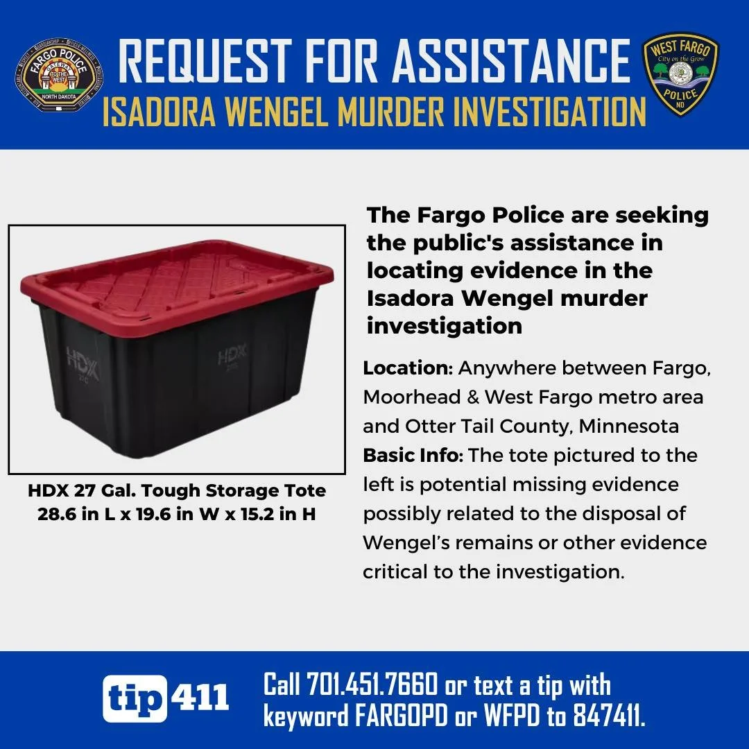 The Fargo Police Department and West Fargo Police Department said Friday, Feb. 13, that 25-year-old Isadora Wengel’s remains have not been located and the homicide investigation remains active. Investigators continue asking for help locating a specific storage tote they believe may be tied to the disposal of her remains or other critical evidence.